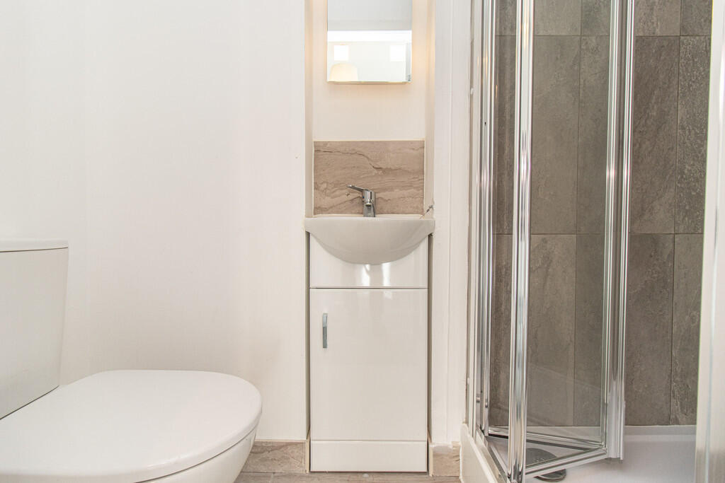 WC Laminate flooring. WC. Vanity wash hand basin with storage beneath and mixer tap above. Extractor fan. Pendant light fitting.
