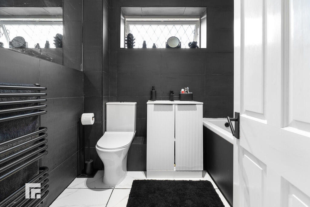 FAMILYBATHROOM7' 0" x 5' 4" (2.15m x 1.65m) Modern white suite comprising low level wc, vanity wash basin with storage below, panelled bath with central taps and black matte twin head shower above and swivel glass shower screen. Full wall tiling. Tiled flooring. Matte black heated towel rail.