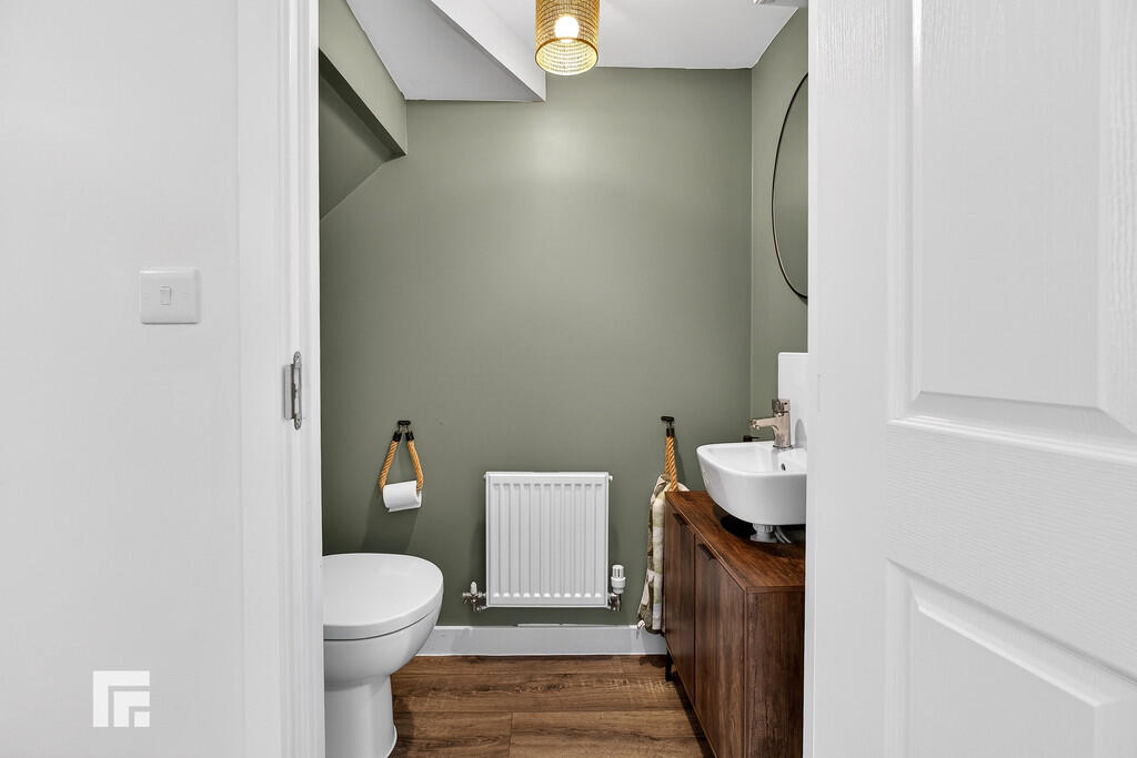 CLOAKROOM Modern white suite comprising low level wc, wash hand basin, extractor fan and radiator.