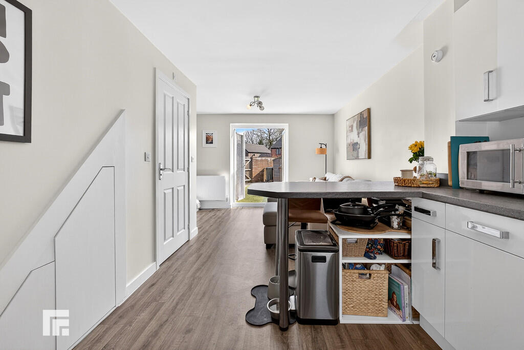 OPENPLANLOUNGE/KITCHEN22' 1" x 12' 1" (6.75m x 3.70m) Kitchen well appointed along two sides in light high gloss fronts beneath wood grain effect laminate worktop surfaces, inset 1.5 bowl stainless steel sink with side drainer, inset 4 ring gas hob, integrated oven below, space for fridge freezer, plumbing for washing machine, matching range of eye level wall cupboards, peninsular style worktop breakfast bar, window to front, lounge area with french doors to the rear garden, understairs built in storage, two radiators. Concealed ideal logic combi gas central heating boiler. Door to cloakroom.