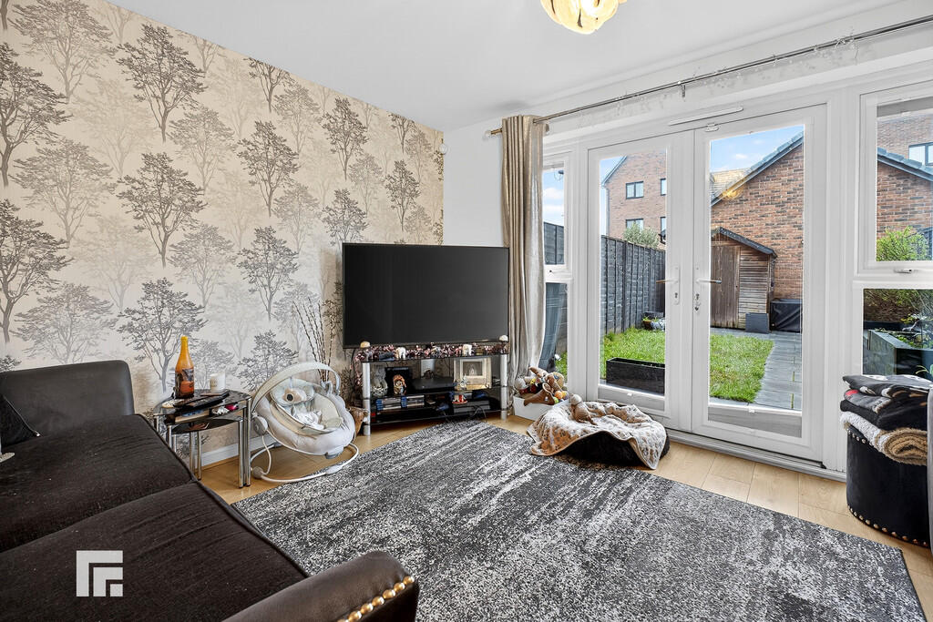 LOUNGE/DINER12' 9" x 15' 1" (3.91m x 4.62m) A light and airy lounge/diner offering ample space for a dining table and chairs. The room features wood-effect flooring, smooth walls with a feature wallpapered wall, and a smooth ceiling. Double-opening French doors lead out to the rear garden. There is a carpeted staircase with a wooden banister rising to the first floor, with useful storage space beneath the stairs, and a radiator.