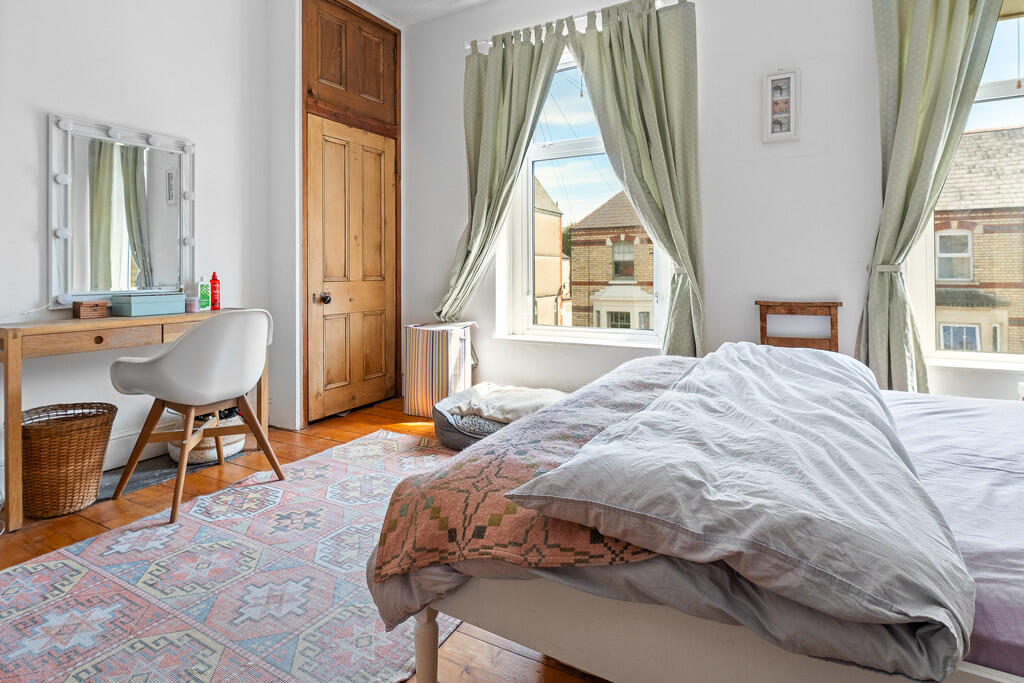 MASTERBEDROOM15' 8" x 11' 7" (4.78m x 3.55m) Continuation of the exposed floorboards. Two double glazed uPVC windows to front aspect. Power points. Pendant light fitting. Two storage cupboards. Radiator.