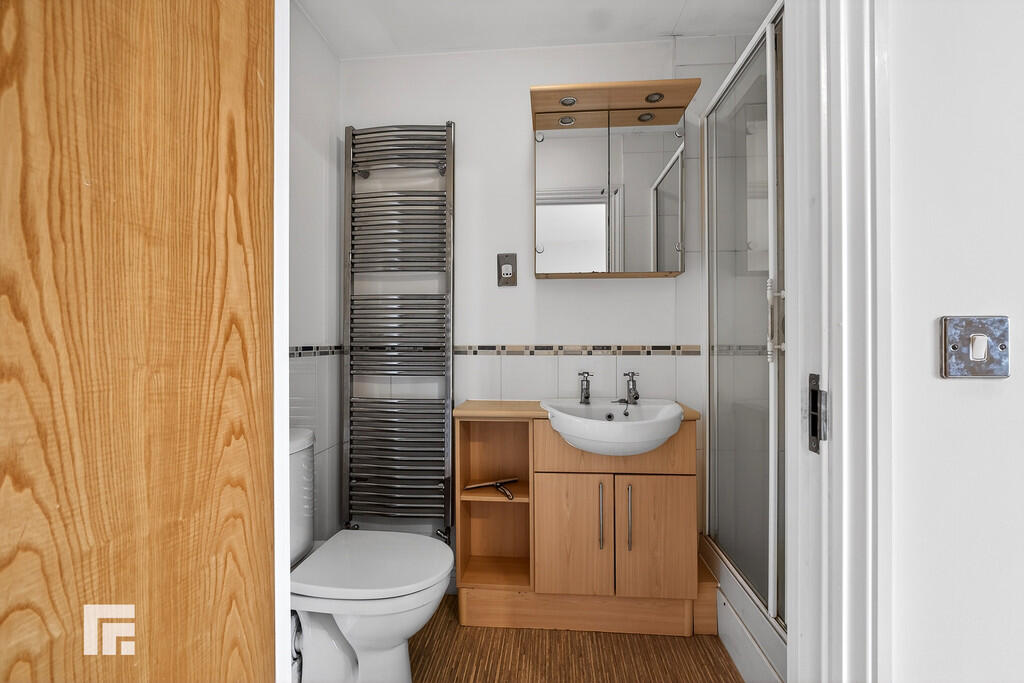 ENSUITE Vanity wash hand basin with storage and unit lighting over. Wall mounted mirrored cabinet. Part tiled walls. Vinyl flooring. W.C. Double shower cubicle with sliding glass door and mains shower over. Extractor fan. Shaver point. Heated towel rail.