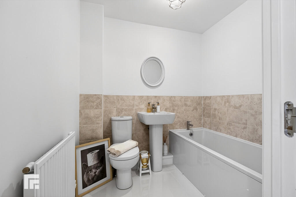 BATHROOM Porcelain tiles continued. Suit to comprise closed cistern W.C, wash hand basin and panelled bath. Radiator.