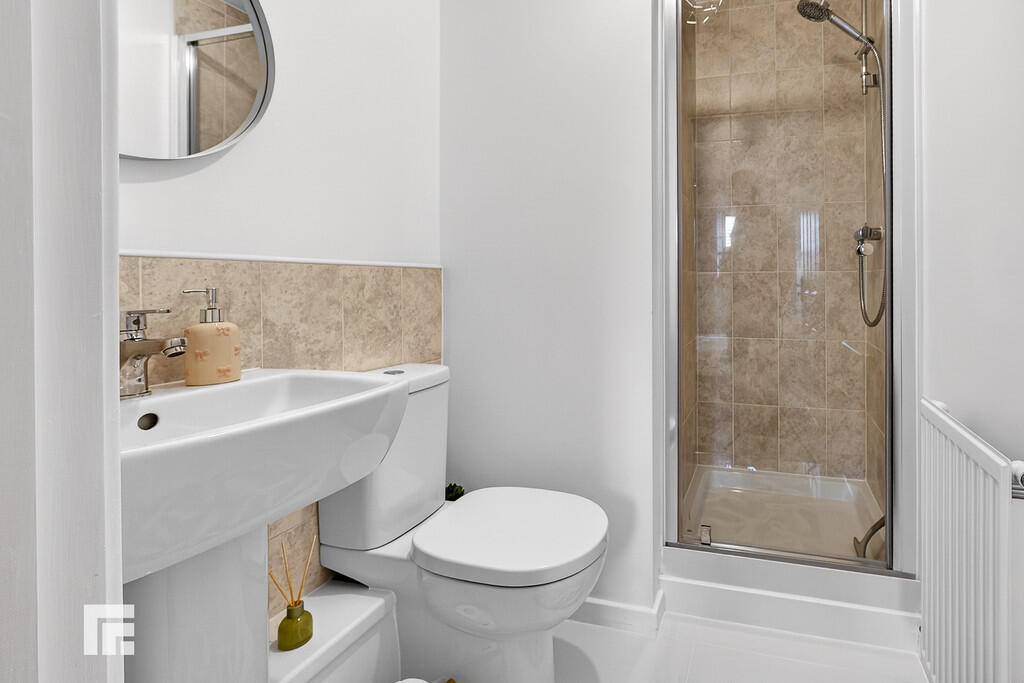 ENSUITE Porcelain tiles. With suite to comprise closed cistern W.C, wash hand basin, shower enclosure with shower in situ. Radiator.