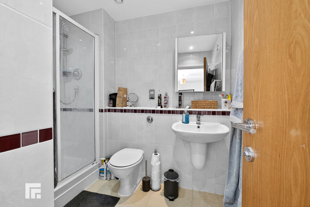 EN-SUITE7' 0" x 6' 11" (2.14m x 2.12m) Large modern en-suite. Tiled flooring. Fully tiled walls. Double shower cubicle. Wall mounted wash hand basin. W.C. Shaver point. Heated towel rail. Extractor fan. Spotlights