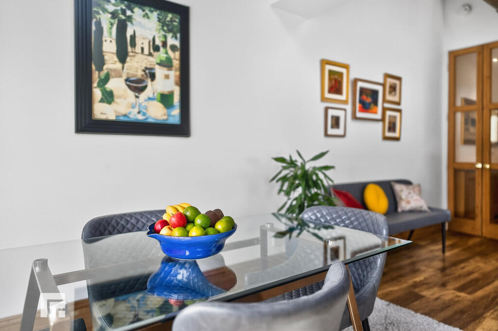KITCHEN A good size modern kitchen/diner with double glazed French doors giving access to balcony. Light grey matt wall and base units with granite work surfaces incorporating sink unit and drainer. Built in gas hob, integrated double oven/microwave, integrated dish washer and washing machine. Tiled splashbacks, plinth lighting. Feature exposed brick to vaulted ceiling, Continuation of wooden flooring. Vertical modern radiators. Power points.