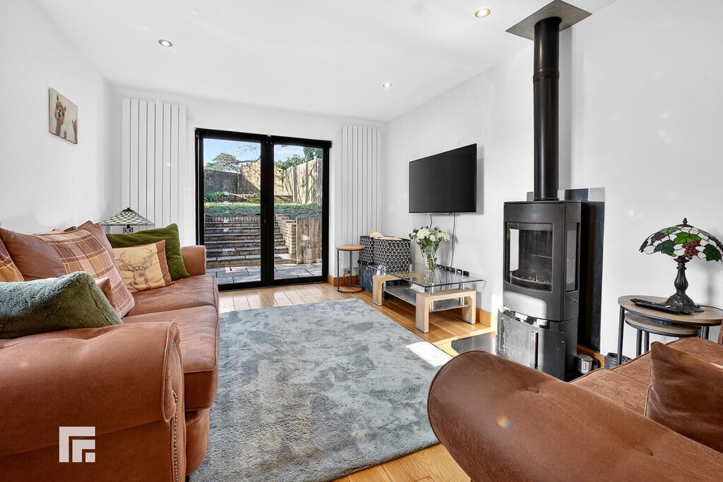 LOUNGE20' 4" x 10' 9" (6.2m m x 3.3mm) Entered via aluminium door into lounge area. Radiator. Door to downstairs WC. Engineered oak strip laminate. Double glazed aluminium framed windows to both sides. Double glazed aluminium french doors to rear garden. Two contemporary vertical radiators. Log burner. Spotlights. Door to cupboard under stairs. Air source heat pump, Electric central heating, Condenser unit, Fuse box.