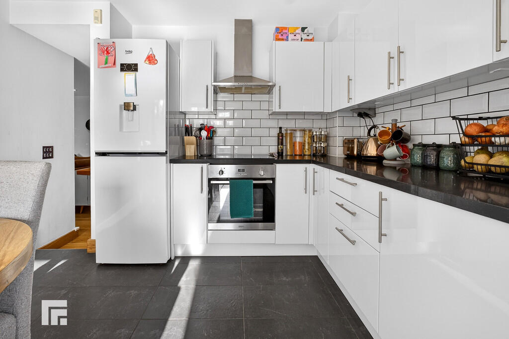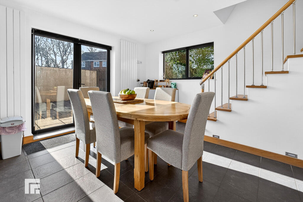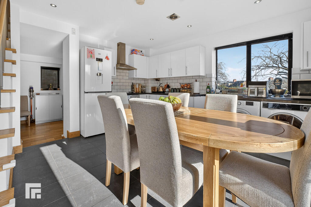 KITCHEN/DINER14' 1" x 13' 9" (4.3m x 4.2m) Aluminium framed double glazed door to rear garden. Tiled flooring and part tiled splash backs. White high gloss range of base and wall units with work surface over. Integrated oven and hob. Inset Belfast sink with mixer tap. Recess for washing machine. Two radiators. Stairs rising to first floor.