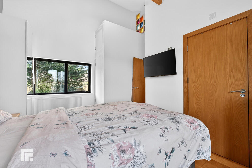 BEDROOM113' 9" x 10' 2" (4.2m x 3.1m) Aluminium French doors to front with apex window above. Window to rear garden. Spotlights to ceiling. Coloured glass feature. Large built in cupboard. Radiator.
