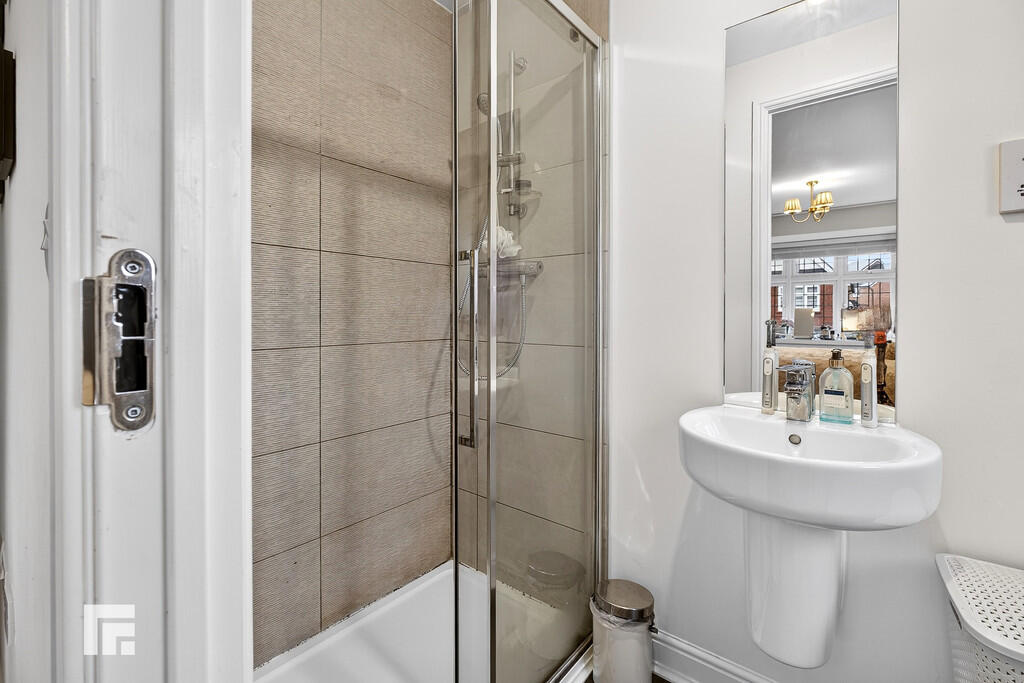 ENSUITESHOWERROOM Quality white suite comprising low level wc, wash hand basin, large shower cubicle with chrome shower above. Tiled splash back. Obscured glass window to side. Electric shaver point. Extractor fan. Chrome heated towel rail.