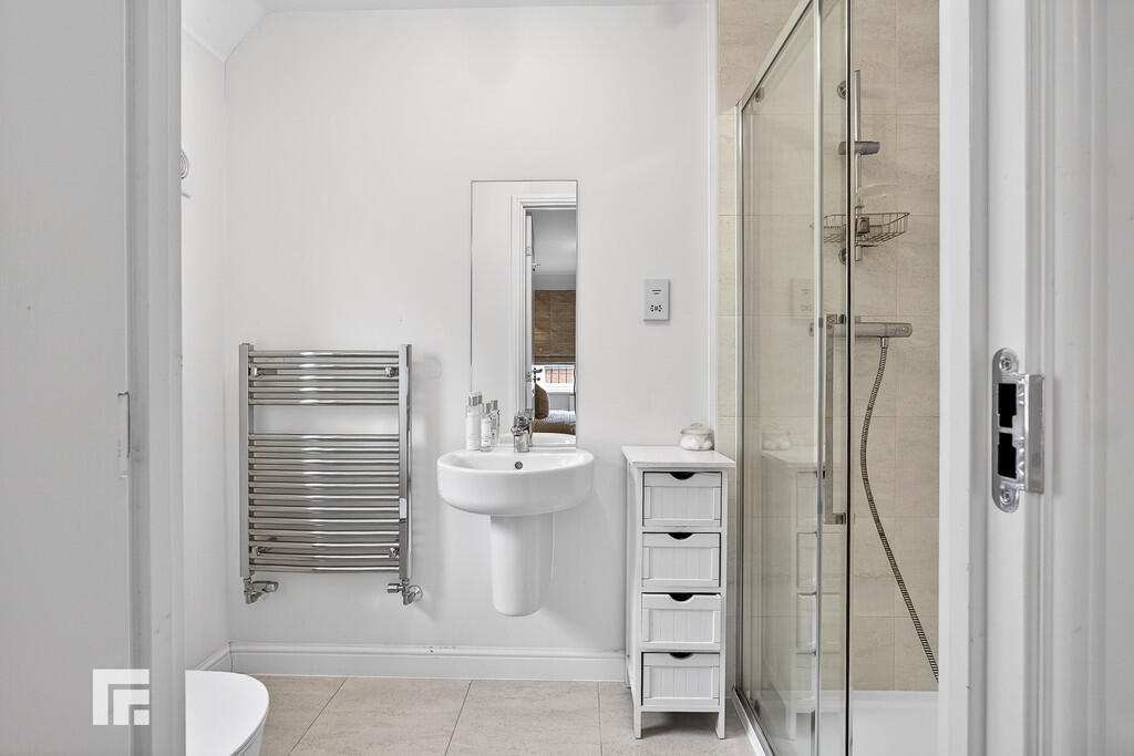 ENSUITE8' 3" x 4' 1" (2.53m x 1.27m) Modern white suite; low level WC, wall hung wash hand baron with chrome mixer tap, shower cubicle with chrome shower and glass sliding shower door. Extractor fan. Shaving point. Chrome heated towel rail. Tiled flooring. Obscured glass window to side.