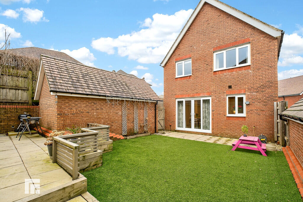 REARGARDEN A beautifully landscaped, sunny, South easterly facing rear garden. Boarded by a brick wall and timber fence, paved patio leading to a large area of artificial lawn. Wooden sleepers and balustrade bordering a further, raised, paved patio seating/barbecue area. Outside tap. Timber gate to side leading to driveway and garage.