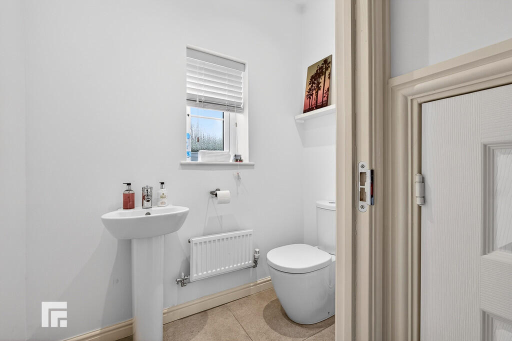 COAKROOM6' 3" x 3' 10" (1.93m x 1.17m) Low level WC and pedestal wash hand basin. Radiator. Tiled flooring. uPVC double glazed window to rear. Sensor spotlights.