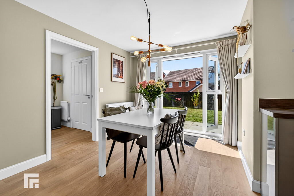 KITCHEN/DININGROOM17' 5" x 12' 4" max (5.33m x 3.78m) Appointed along three sides, modern high and low level cupboards beneath laminate worktops, stainless steel sink with chrome mixer tap and side drainer, integrated four ring gas hob with extractor hood, integrated fridge freezer, integrated oven and integrated dishwasher. Ample space for dining room table. Continuation of engineered oak flooring. Radiator. uPVC window to side and rear. Double French doors opening into the rear garden. Door into utility room.