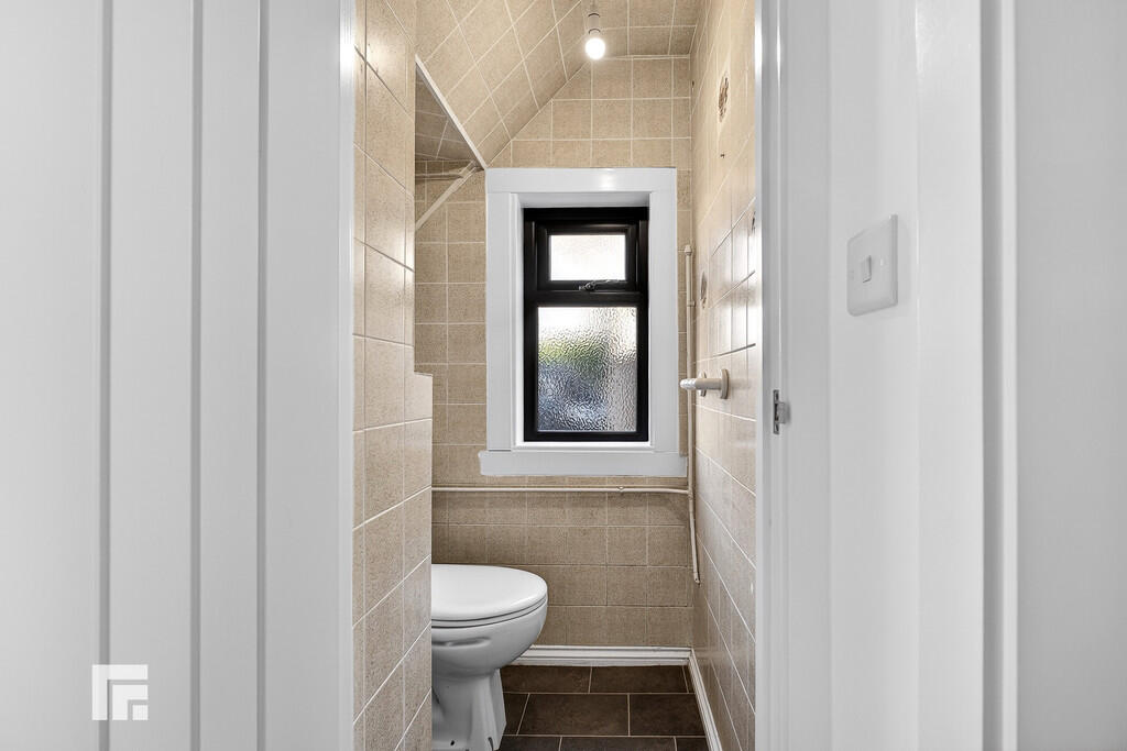 CLOAKROOM Double glazed opaque window to the side. Ceramic tile to all walls. Low level close coupled w.c and wash hand basin.