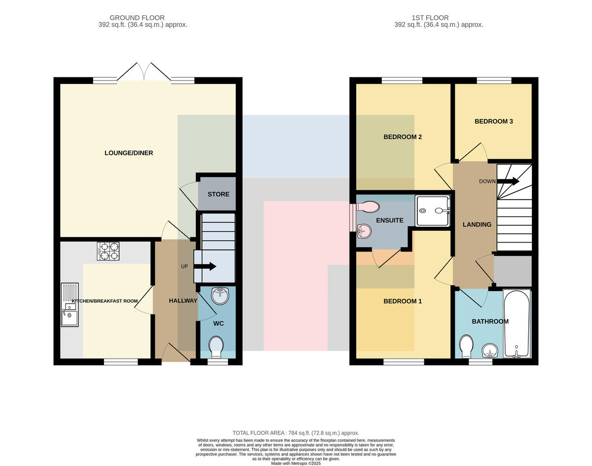 KITCHENANDBREAKFASTROOM10' 4" x 8' 0" (3.16m x 2.44m) Well appointed along two sides in light panelled fronts with chrome bar handles beneath woodgrain effect laminate worktops. Inset 1.5 bowl stainless steel sink with side drainer. Inset four ring gas hob with cooker hood above and oven below. Plumbing for dishwasher. Plumbing for washing machine. Matching range of eye level wall cupboards. Space for fridge freezer. Concealed 'Ideal' combi gas central heating boiler. Window to front. Ample space for family breakfast table. Laminate flooring. Radiator.