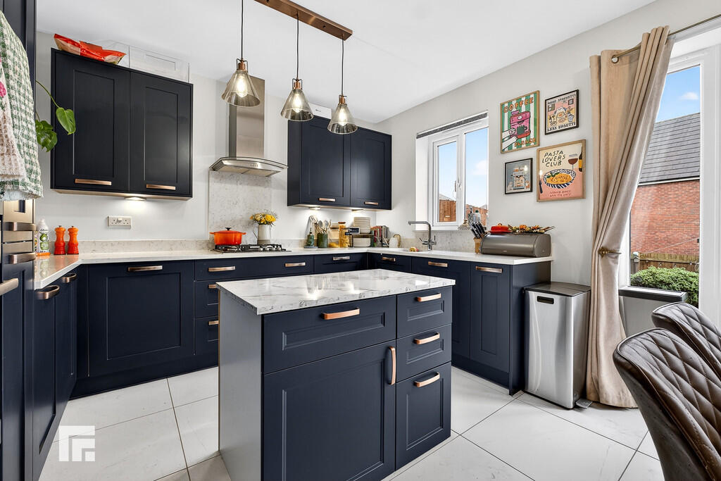 KITCHEN/DININGROOM18' 0" x 11' 4" (5.50m x 3.46m) Appointed along three sides, modern shaker style deep blue low and high level cupboards beneath Silestone (Quartz) worktops, inset 1.5 bowl stainless steel sink with chrome micer tap, integrated 'AEG' five ring gas hob with extractor hood, two integrated 'AEG' single ovens, integrated fridge/freezer and integrated dishwasher. Matching Silestone (Quartz) splashbacks and window sill. Island with low level cupboards and laminate work surface. Built in utility cupboard with plumbing for washing machine and space for tumble dryer. Vertical radiator. Tiled flooring. uPVC window and double French doors to rear.