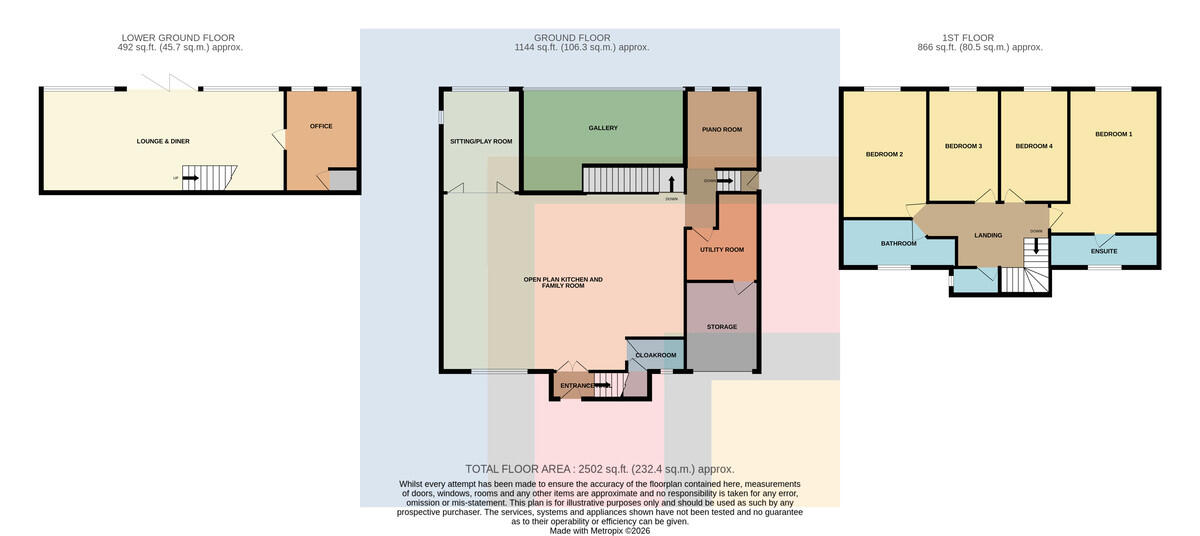 FAMILYBATHANDSHOWERROOM13' 8" x 5' 2" (4.19m x 1.59m) Quality white suite comprising low level wc, wash hand basin, bath with central taps and shower mixer. Large shower cubicle with twin chrome shower heads above. Full wall tiling. Tiled flooring. Obscured glass window to rear. Chrome heated towel rail.
