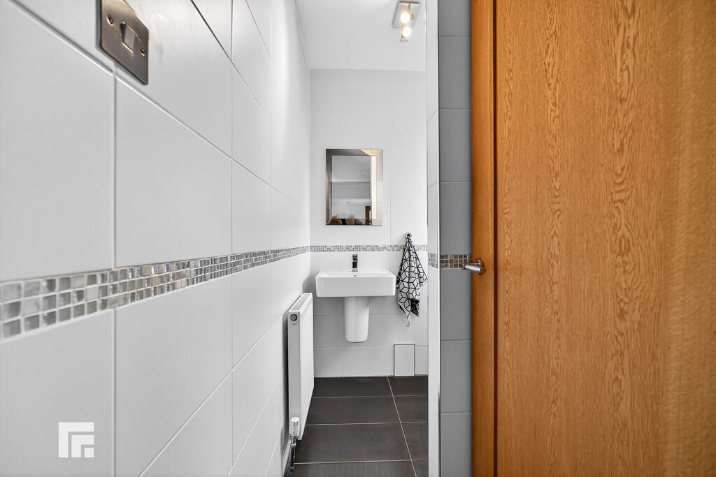 CLOAKROOM Modern white suite comprising low level wc and wash hand basin. Tiled flooring. Full wall tiling. Obscured glass window to front. Under stairs storage cupboard. Radiator.