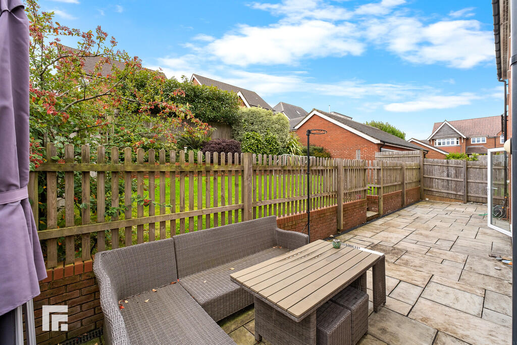 REARGARDEN Enjoying a southerly aspect comprising large paved patio leading upto an area of lawn with rear beds of maturing plants and shrubs. Outside light. Outside tap. Access to side.