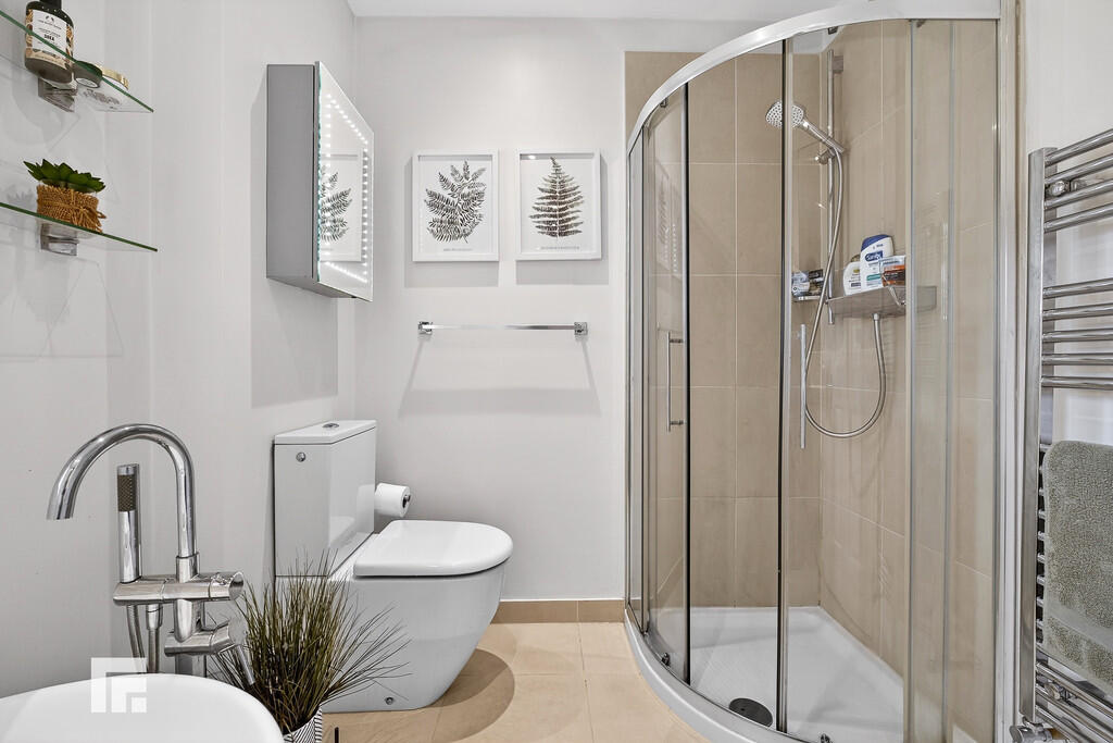 ENSUITESHOWERROOM7' 1" x 4' 2" (2.16m x 1.29m) Quality white suite comprising low level wc, vanity wash basin with storage below, large shower cubicle with sliding glass door and rainfall shower head and separate power shower. Wall tiling to splash back areas. Tiled flooring. Extractor fan. Obscured glass window to side. Chrome heated towel rail.