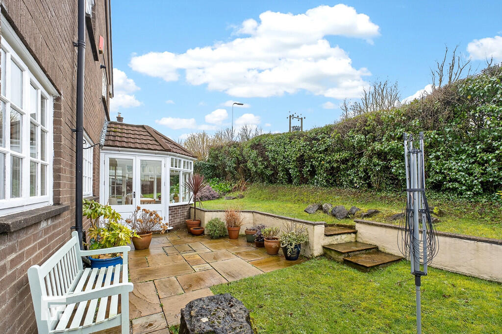 REARGARDEN Enjoying a south westerly aspect paved patio leading onto an area of lawn. Area of lawn continuing to side access. Enclosed by hedgerow to rear boundary.