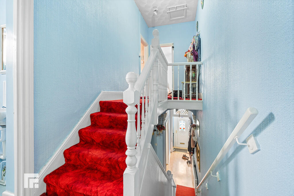 FIRSTFLOORLANDING Split level landing. Carpeted flooring. Pendant light fitting. Loft hatch. Doors to four bedrooms and bathroom.