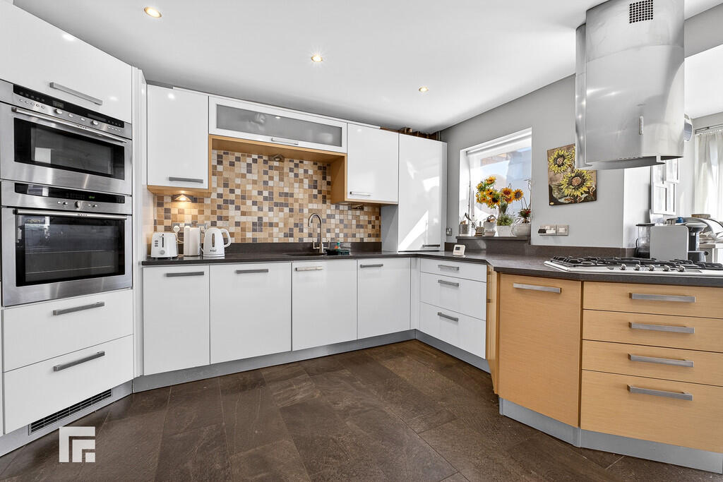 KITCHEN/LIVINGAREA17' 8" x 15' 8" (5.4m x 4.8m) A fantastic open plan kitchen/living area. Extended and modernised 'Keller' kitchen with wall and base units and work surfaces incorporating composite sink, with dual tap and drainer. Ample storage. Tiled splash back. Built in oven and microwave. Four ring gas hob, with stainless steel extractor hood over. Integrated washing machine and dishwasher. Space for fridge freezer. Tiled flooring. Spotlights. Wall mounted radiator. Double glazed uPVC patio door leading to rear and allocated parking space. Additional double glazed uPVC window to rear aspect. Ample natural daylight.