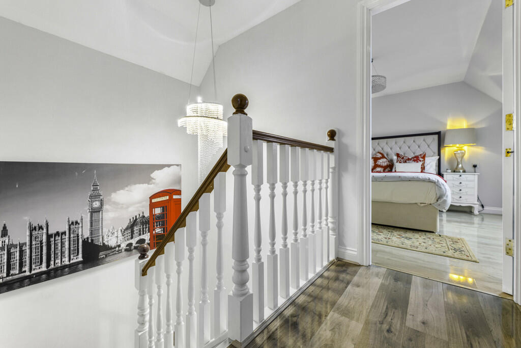 ** FIVE BEDROOM DETACHED WITH DETACHED DOUBLE GARAGE ** LARGE REAR GARDEN ** A double bay fronted, well presented, five bedroom detached family house in the sought after location of executive detached homes. Entrance hallway, cloakroom, bay fronted lounge, bay fronted sitting room, modern fitted kitchen and breakfast room with rear bay window and utility room. To the first floor are three bedrooms, primary bedroom with ensuite shower & bathroom room and there is a separate family bathroom. To the second floor are two further double bedrooms and a family shower room. Gas central heating, double glazing. Large lawned rear garden. Driveway to front leading to the detached double garage. EPC Rating: C