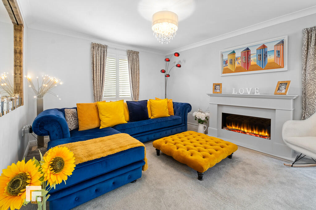 OPENPLANKITCHEN/DININGANDFAMILYROOM27' 5" x 21' 2" (8.37m x 6.47m) An excellent open plan family area with ample space for family seating and dining area. Feature media wall with inset electric fire and tv recess fireplace. There is a modern fitted kitchen appointed along one side in cappuccino colour high gloss fronts beneath quartz worktop surfaces. Inset 1.5 bowl sink with worktop side drainer and boiling water tap. Integrated full size fridge and full size freezer. Integrated 'Bosch' oven and coffee machine above. Breakfast bar island with quartz worktop and an abundance of storage. Inset four ring 'Bosch' induction hob. Inset kitchen ceiling speakers. Porcelain tiled flooring throughout. Windows to front with fitted shutters. Two windows to sides and french doors to the delightful rear garden. Door to utility room and door to cloakroom.
