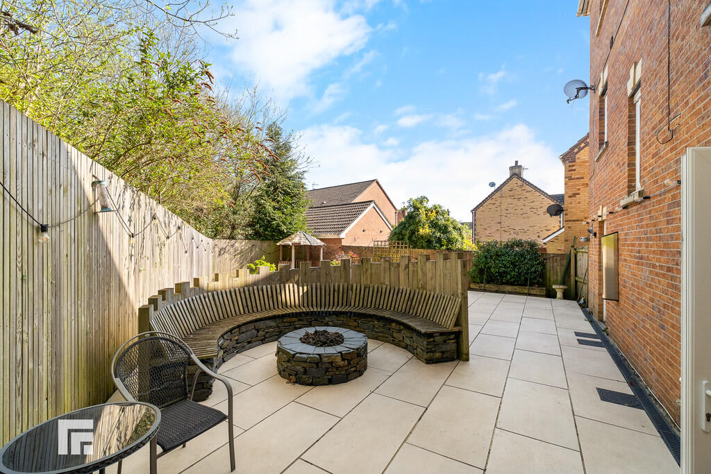 REARGARDEN A sizeable and beautifully presented rear garden offering low maintenance with large patio area and rear decked relaxation area. Semi circular seating area with central stone gas fire pit connected from the mains . The garden is enclosed by timber fencing with timber gate to one side. To the other side is a large timber built bar with central glass roof, timber flooring, outside power points and outside lighting. This area also opens up to the front garden making maximum use of rear, side and front gardens.