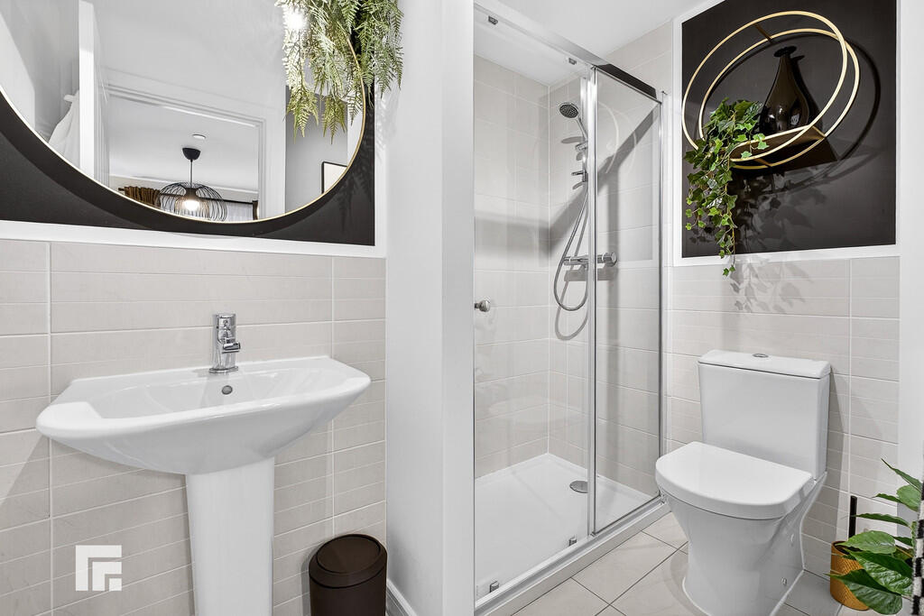 ENSUITESHOWERROOMTWO7' 3" x 5' 8" (2.22m x 1.74m) Modern white suite comprising low level wc, wash hand basin and large shower cubicle with chrome shower. Tiled splash back. Tiled flooring. Extractor fan. Radiator.