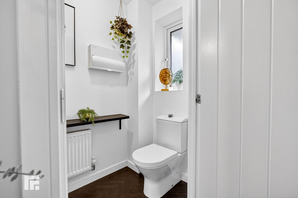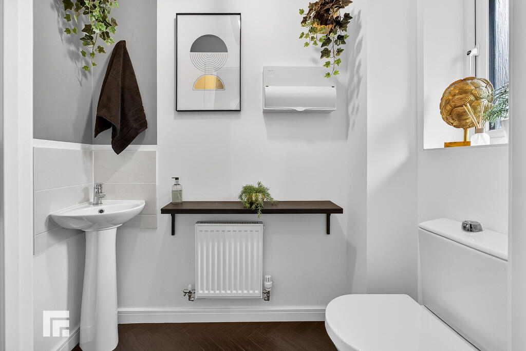 CLOAKROOM Window to the front aspect. Featuring a low level w.c and wash hand basin. Continuation of flooring. Radiator.