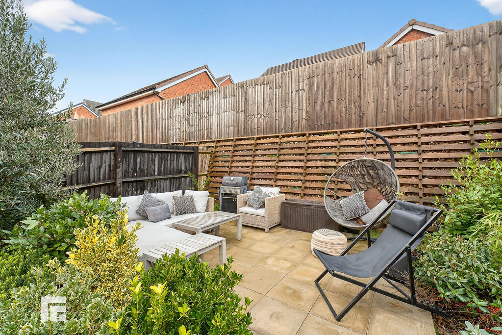REARGARDEN A delightful enclosed rear garden comprising patio leading onto an area of lawn with near borders of plans and shrubs with additional upper paved patio relaxation area. Outside tap. Outside lighting timber gate giving access to side drive.