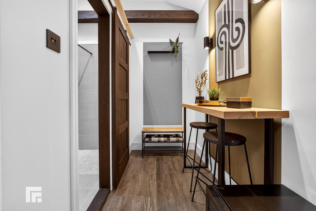 GARAGECONVERSION19' 3" x 9' 8" (overall)(5.87m x 2.96m) Exceptional garage conversion with tall vaulted ceiling and exposed beams, offering versatile use currently utilised as an independent fifth bedroom with modern en-suite shower room.