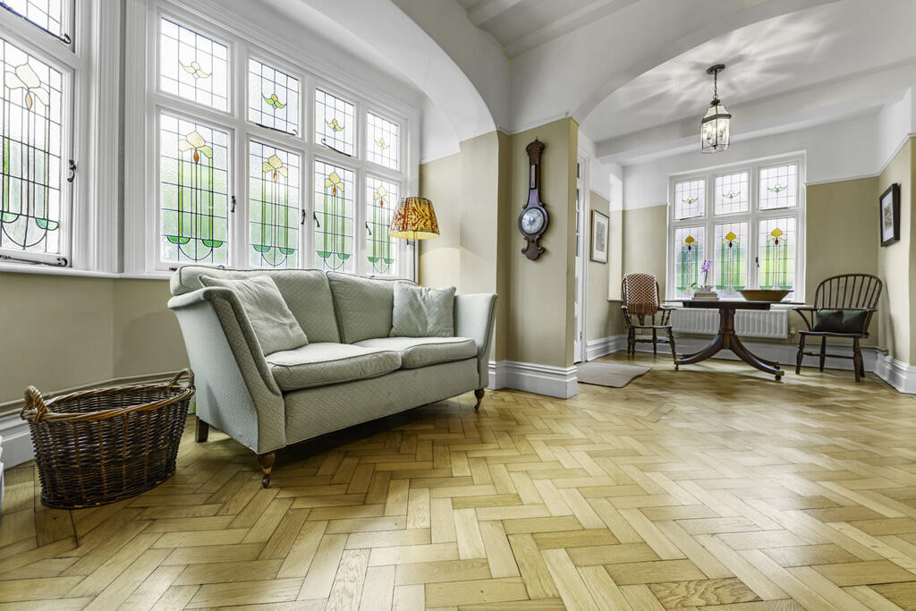 RECEPTIONHALLWAY23' 5" x 23' 3" (7.14m x 7.09m) Approached via the original wood panelled stained glass entrance door leading to the exceptionally spacious reception hallway with stained glass windows to two aspects. Feature open fireplace. Quality herringbone style woodblock flooring. Staircase to first floor.