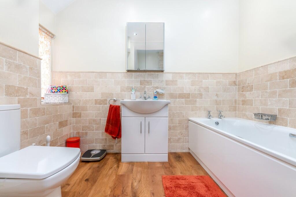 SECONDBATHROOM11' 9" (max) x 8' 8" (max) (3.588m x 2.645m) Original window to front. Part tiled walls. Panelled bath. Low level wc. Double shower cubicle. Heated towel radiator. Vanity unit with inset sink and cupboards below.